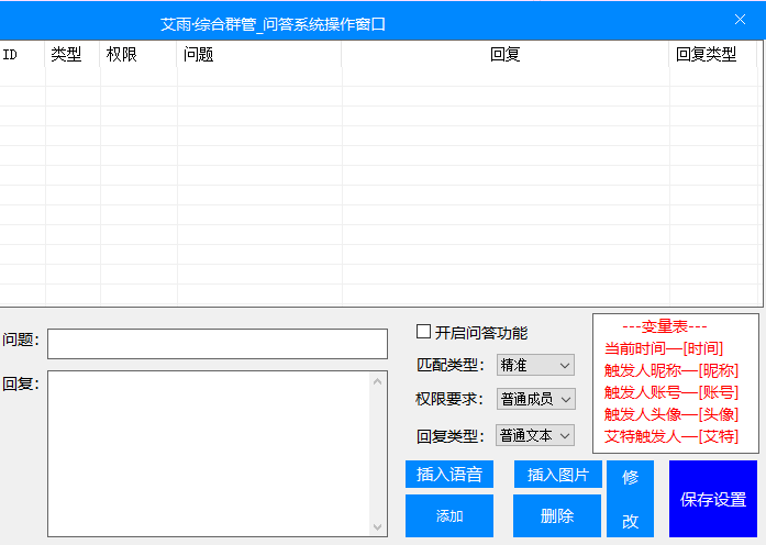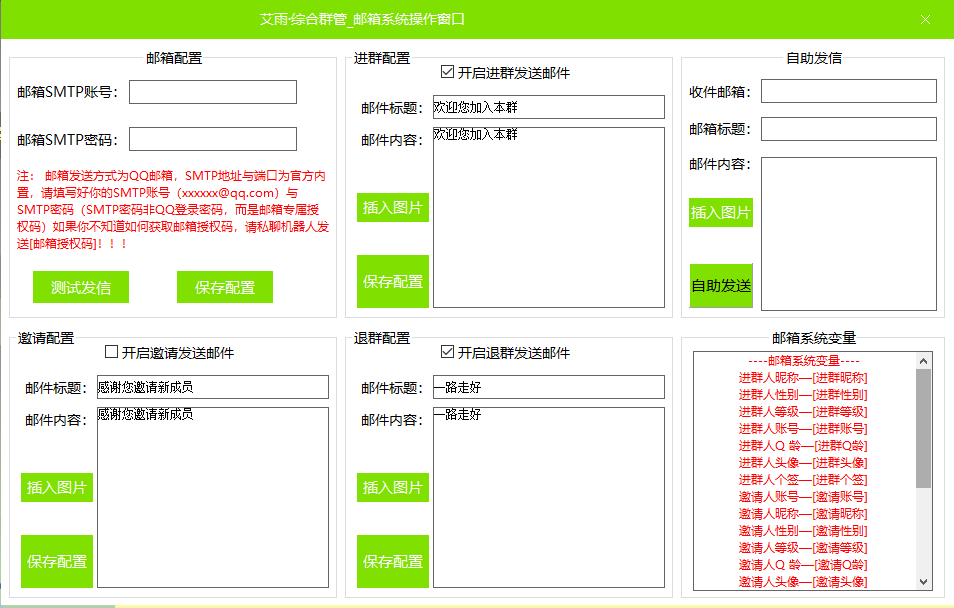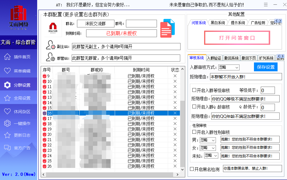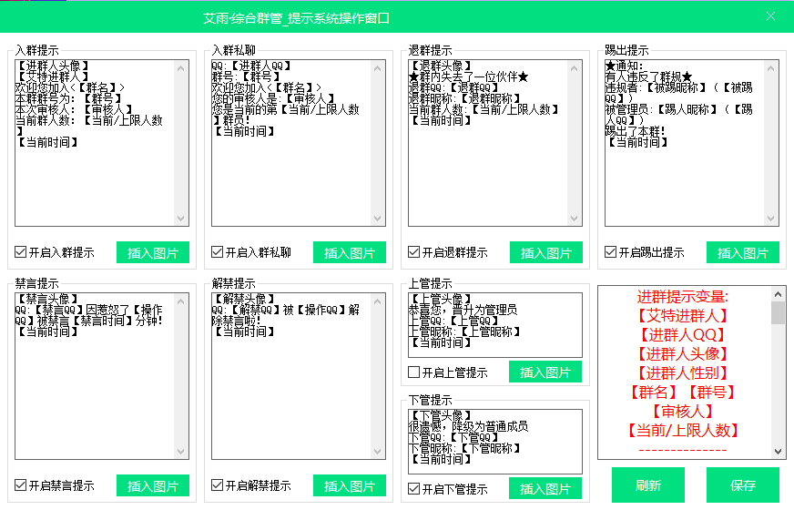 运行环境:Windows系统 - 支持以下类型框架 Ebot框架 Bear框架Wolf框架 DuLu框架MyQQ框架 Panda框架RemixQQ框架 小栗子框架等等多种类型的QQ机器人框架...... 艾雨综合群管插件是一款集几十种功能于一体的超级QQ群管机器人,能够帮助你轻松管理多个QQ群!你可以不使用,但是不能没有,这就是艾雨综合群管系统!