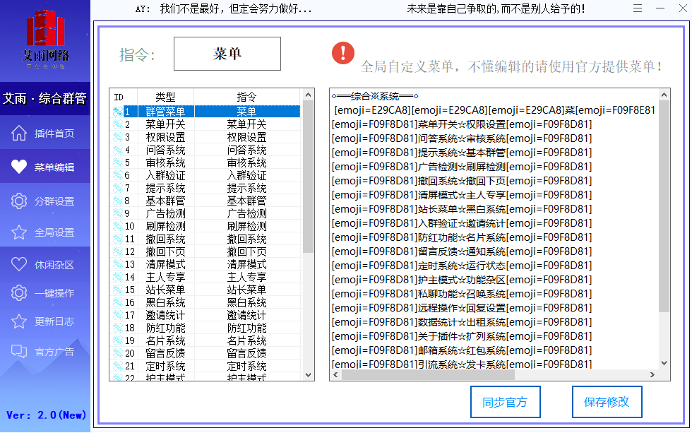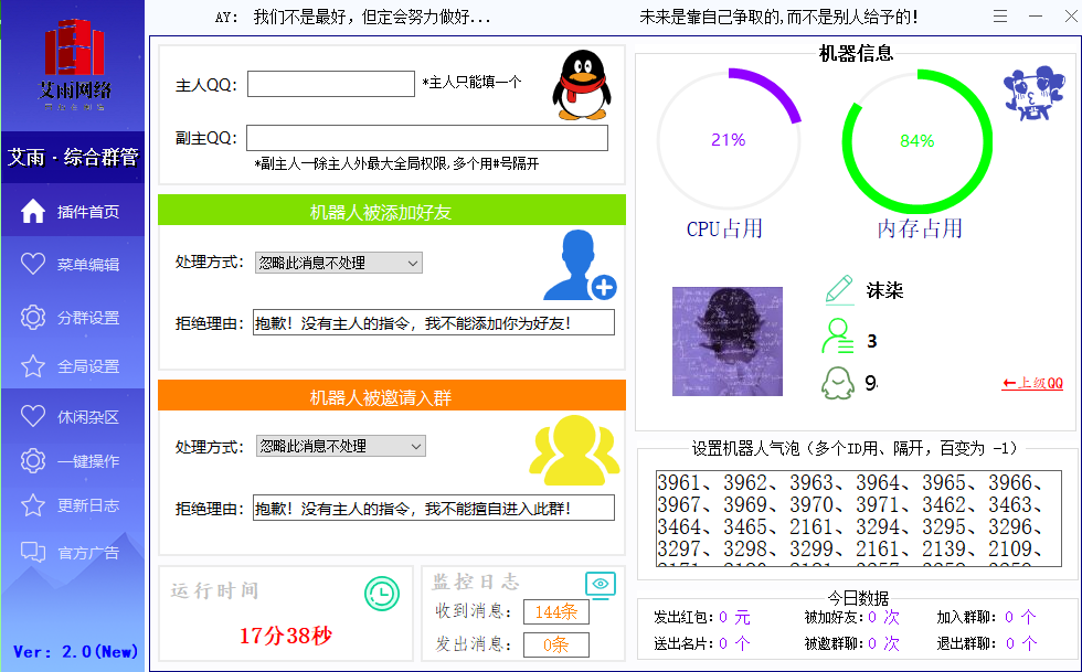 运行环境:Windows系统 - 支持以下类型框架 Ebot框架 Bear框架Wolf框架 DuLu框架MyQQ框架 Panda框架RemixQQ框架 小栗子框架等等多种类型的QQ机器人框架...... 艾雨综合群管插件是一款集几十种功能于一体的超级QQ群管机器人,能够帮助你轻松管理多个QQ群!你可以不使用,但是不能没有,这就是艾雨综合群管系统!